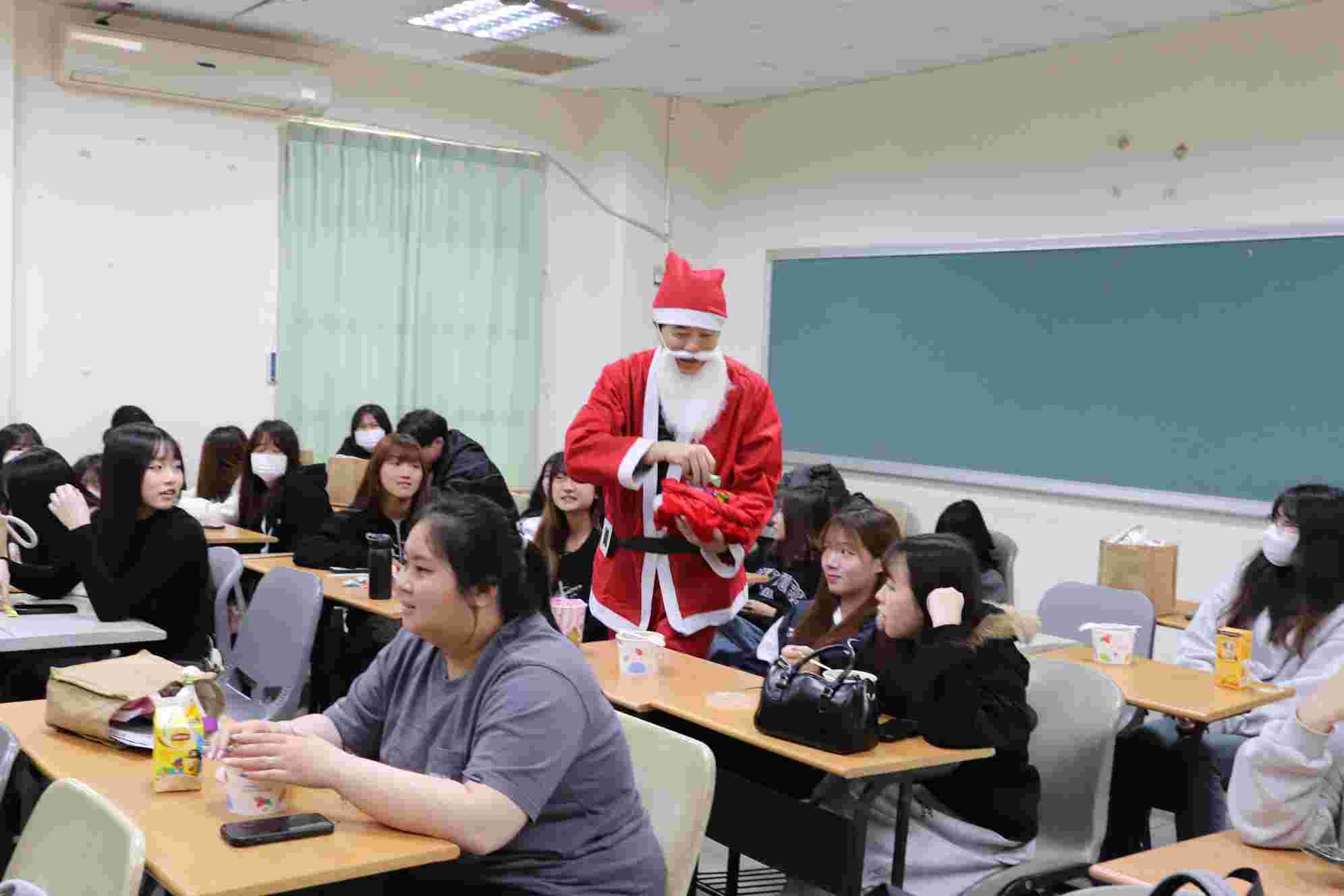 了走逛校園發送糖果和餅乾,華醫的聖誕老人和麋鹿團也以快閃方式,隨機進到教室和師生同歡,讓不少正在開班週會的師生驚喜連連,大家開心搶著和聖誕老人拍照。來自越南的外籍生,看到聖誕老人和麋鹿出現在教室驚喜歡呼,並對學校用心營造歡樂氣氛感到窩心。