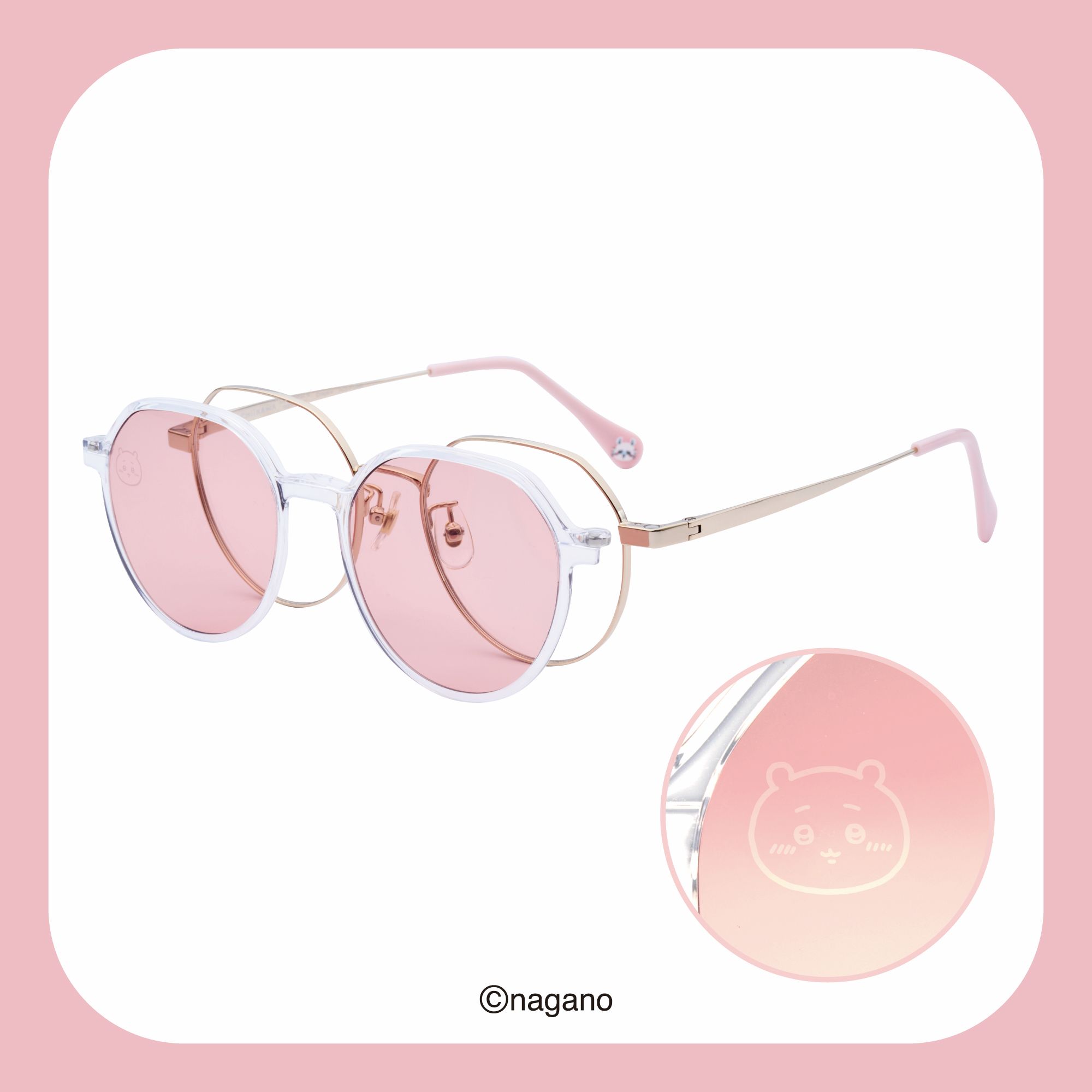 吉伊卡哇與小桃鼠 Switch系列,推出兩色皇冠框設計,鏡片前片有吉伊卡哇雷射雕刻,鏡腳內側印有代表吉伊卡哇武器的防暴鋼叉;鏡腳尾端印有吉伊卡哇與小桃鼠。以角色為概念的銀色鏡框搭配桃紅色前片,更能襯托紅潤氣色。