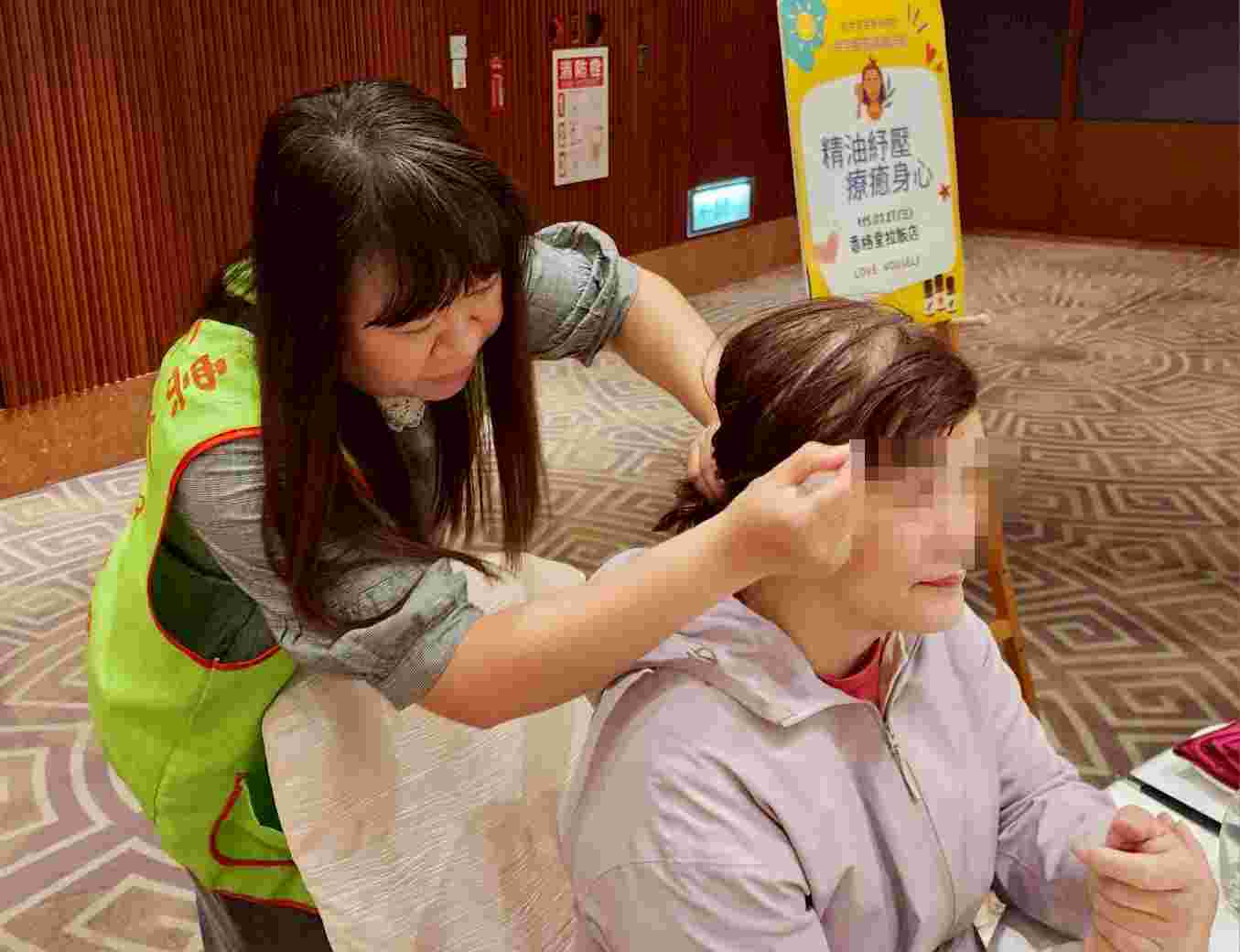 ▲ 社工蘇珮華與服務個案家屬分享精油舒壓身心活動,藉此減輕照顧壓力
