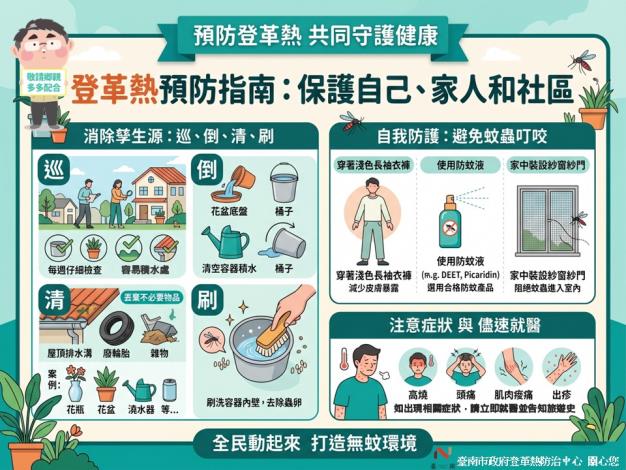 市府也再次強調,防疫的關鍵核心仍是每週執行的「巡、倒、清、刷」。市民朋友應將其視為固定的居家例行公事,徹底消滅蚊蟲的生命源。切記,只要將環境周遭的積水處源源不絕地清除,才能有效阻斷登革熱的傳播鏈,共同守護社區的健康安全。