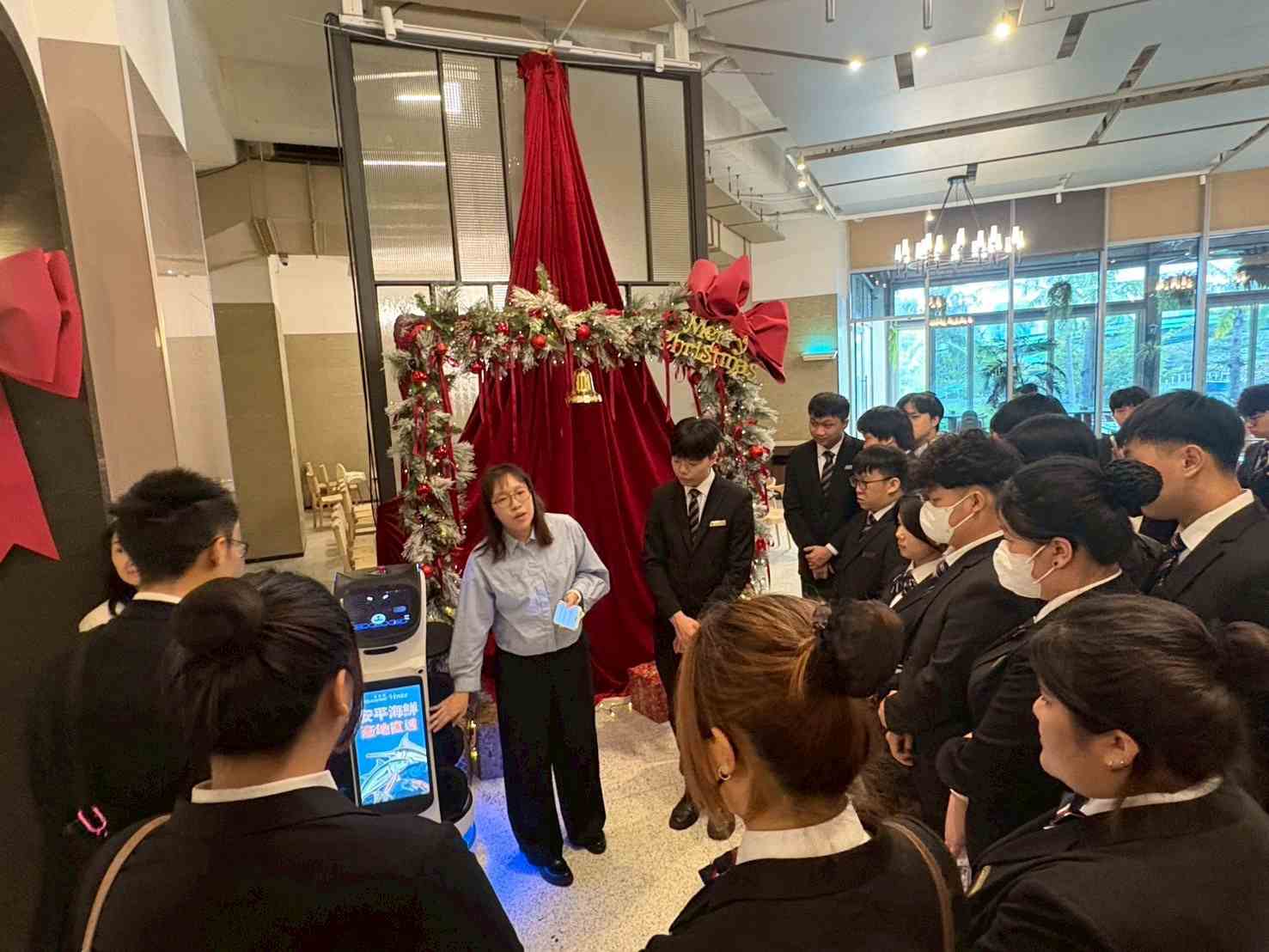 ▲ 師生至福爾摩沙遊艇酒店參訪,飯店主管介紹送餐機器人迎接AI世代來臨,崑山科技大學餐飲管理及廚藝系推動「智慧雨林產業創生人才育成