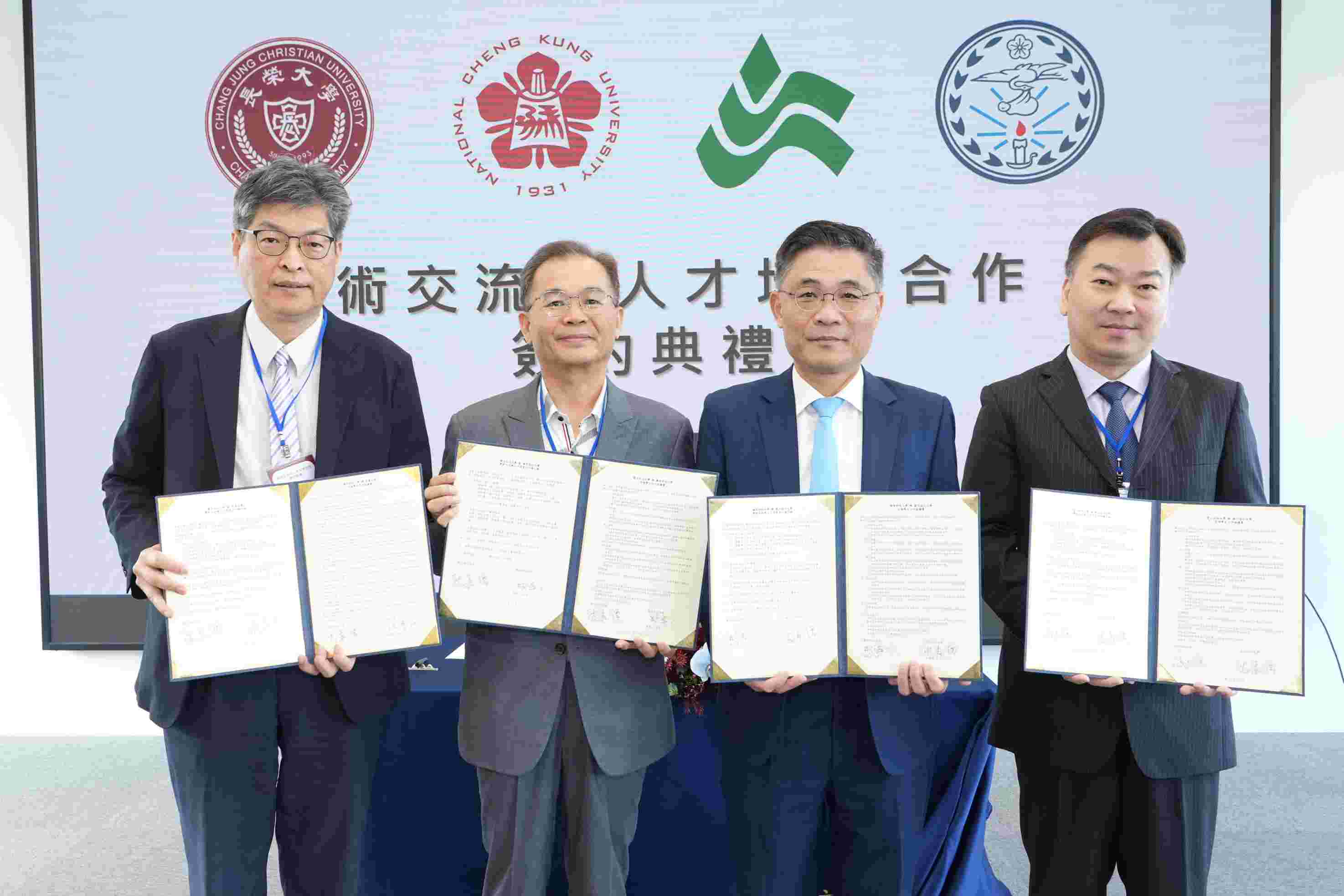 ▲ 崑山科大與成大等校共推跨校人才培育,(右起)崑山科大李天祥校長、成功大學沈孟儒校長、輔英科大林爵士校長、長榮大學孫惠民校長合影
