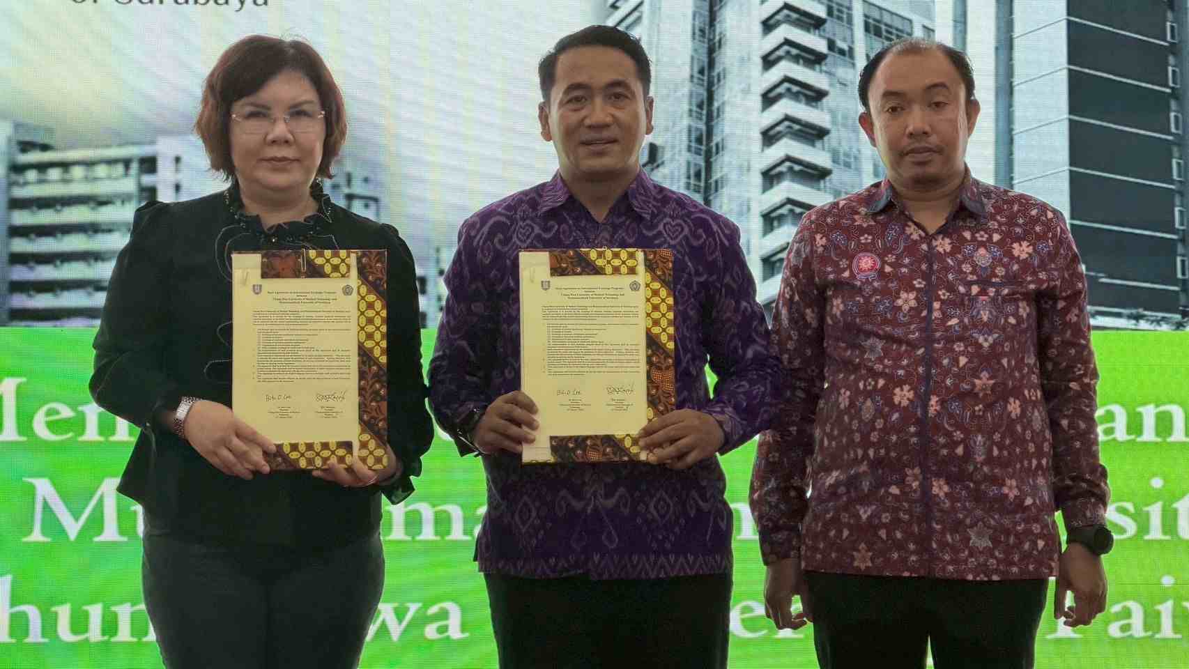 ▲中華醫大校長李碧娥博士(左)和穆罕默德大學校長Dr. Mundakir, S.Kep., Ns., M.Kep.(中)代表兩校簽