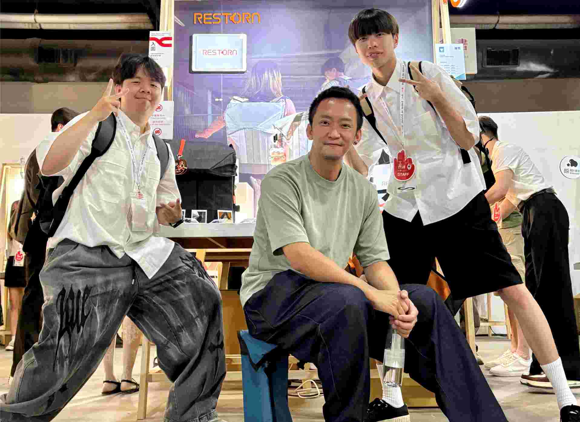 ▲ 蔡銘君老師(中)指導李昀庭(左)、李茗富(右)、陳昶任、方予岑的作品《RESTORA》,奪下時尚類包款設計金獎崑山科技大學視覺