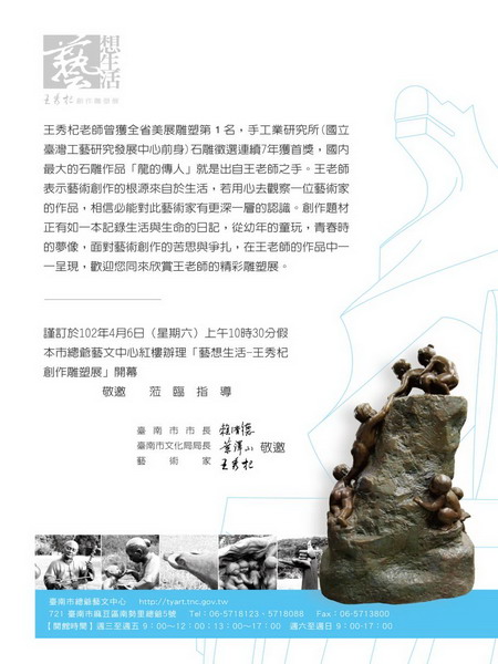 本市總爺藝文中心訂於102年4月4日(四)起至102年6月9日(日)止,於紅樓展館辦理「藝想生活-王秀杞創作雕塑展」,邀請藝術家王秀杞展出共66件精彩