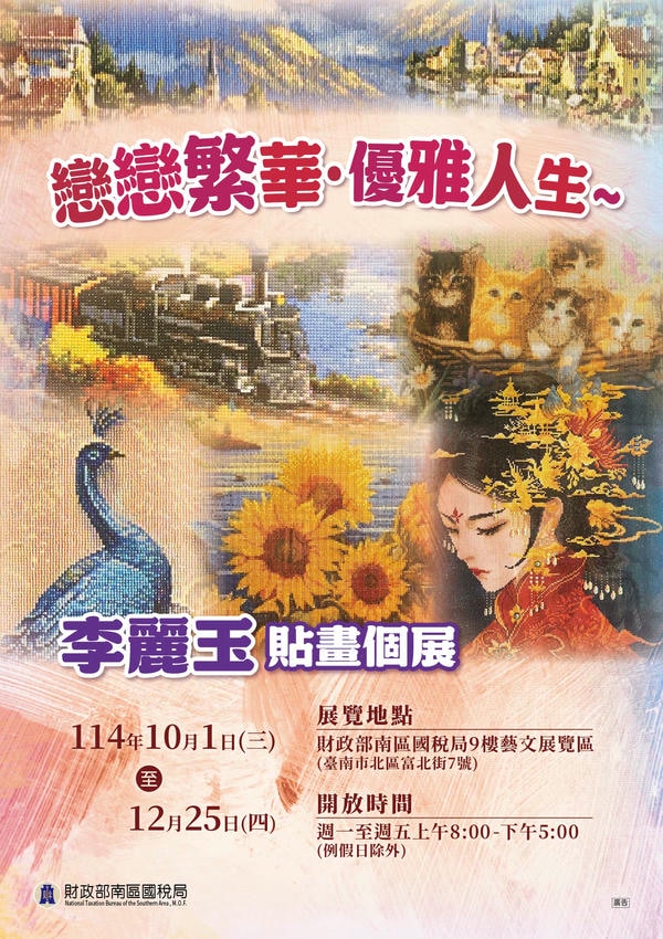 ▲ 海報-戀戀繁華_優雅人生-李麗玉貼畫個展財政部南區國稅局於114年10月1日至12月25日止,在該局9樓藝文展覽區展出「戀戀繁