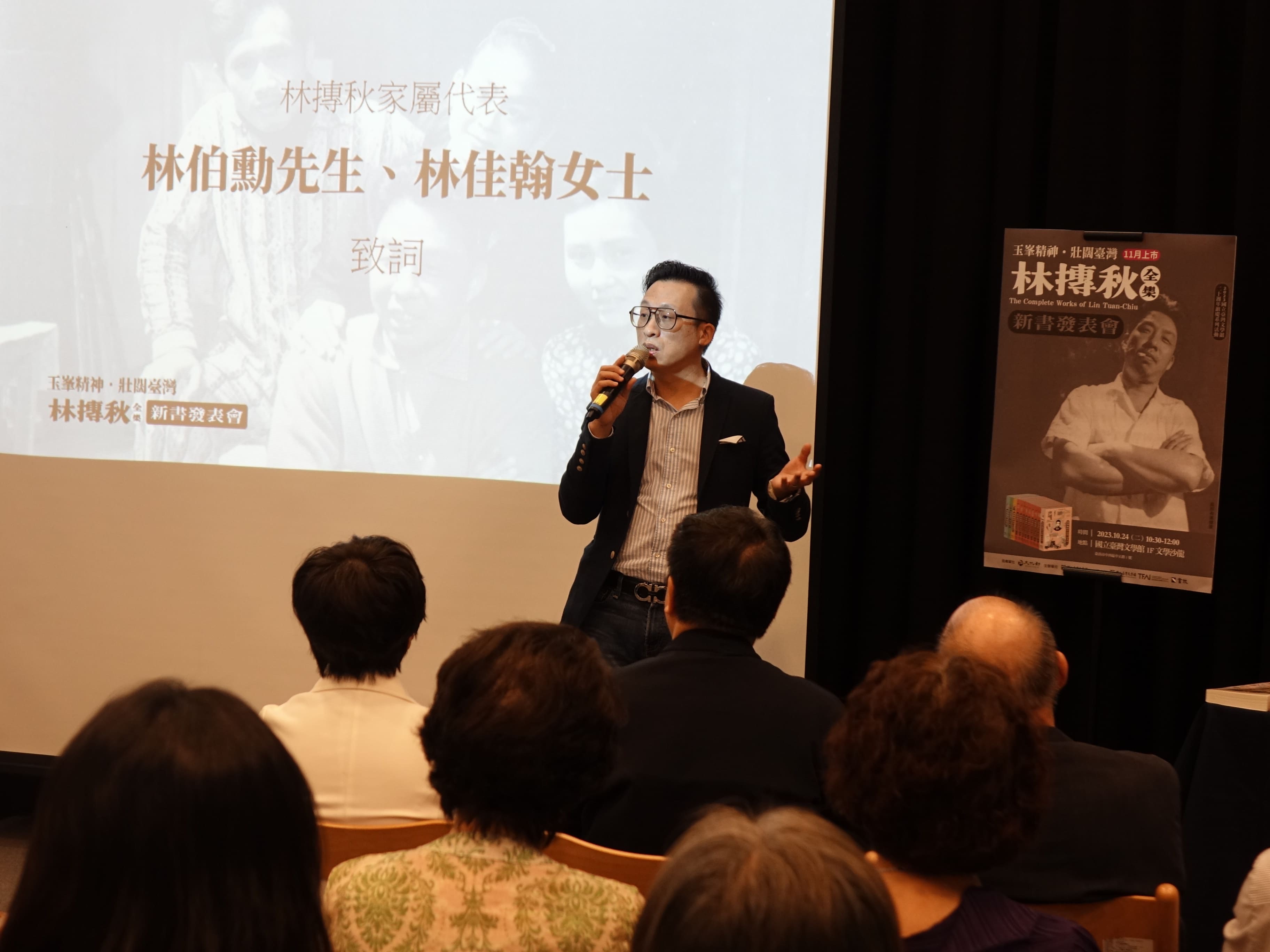▲ 林摶秋之孫林伯勳先生致詞。記者 沈 薇/報導國立臺灣文學館、國家電影及視聽文化中心、書林出版有限公司今(24)日共同舉辦《林摶
