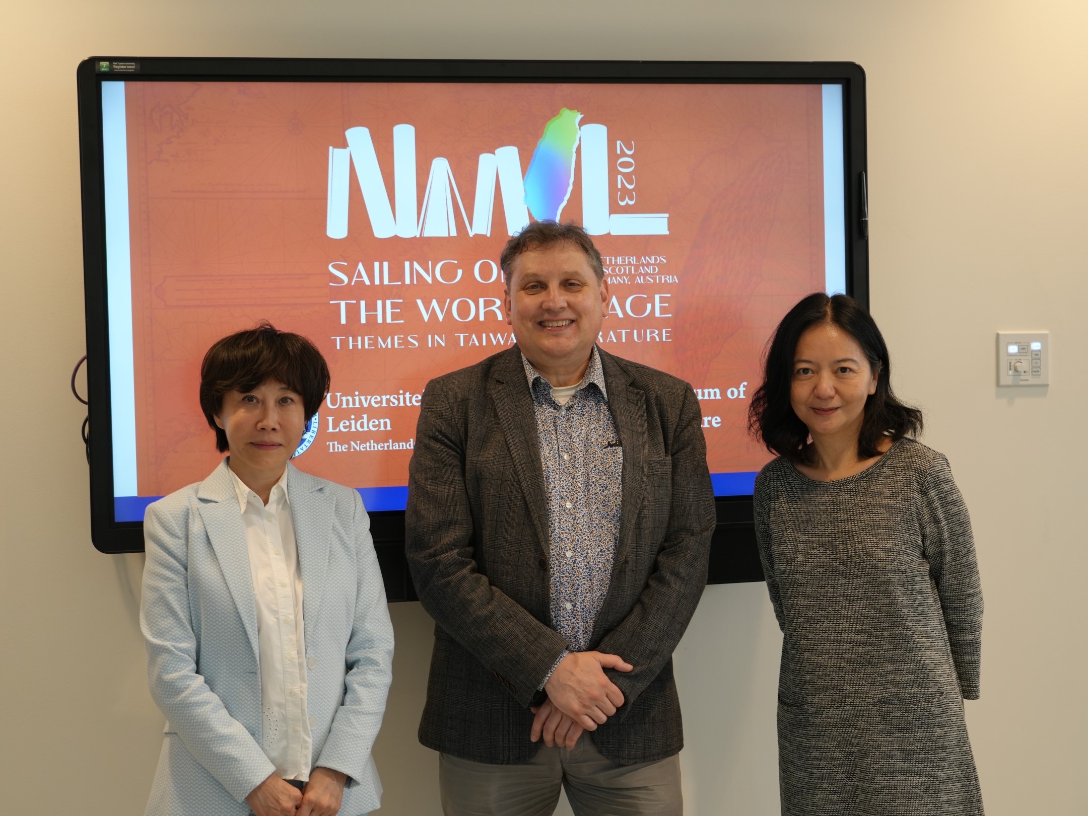 ▲ (左起)臺文館館長林巾力、萊頓大學圖書館副館長馬可.德.尼特(Marco_de_Niet)與駐荷蘭台北代表處代表陳欣新合影。(