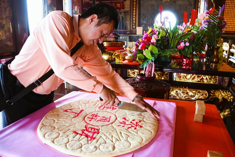 ▲ 每年西勢廣興宮擔餅節,沈旺成固定製作水果餅,2018年更製作重達10斤的水果餅。(張耘書拍攝) 臺南是美食之都,